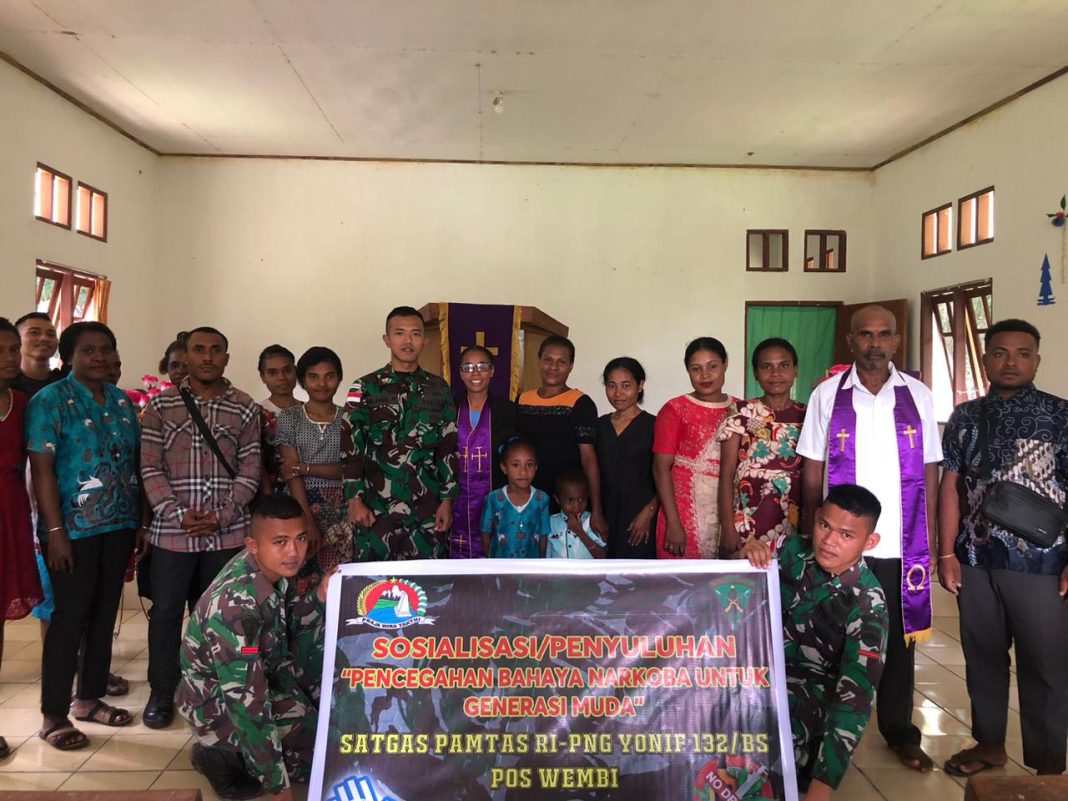 Lentera Warga, Keerom | Satgas Pamtas RI-PNG Sektor Utara Yonif 132/BS Pos Wembi melaksanakan penyuluhan bahaya penyalahgunaan narkoba bagi generasi muda Di Kp.Piyawi, Distrik Mannem, Kab.Keerom, Provinsi Papua, Rabu (22/02/2023).