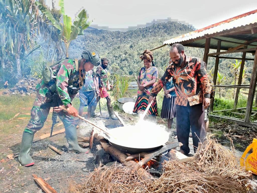 Nduga, Lentera-Warga | Satgas Yonif Raider 321/GT/13/1 Kostrad tunjukan perhatian terhadap warga yang mengalami kedukaan melalui pemberian bantuan sembako bertempat di Distrik Dal, Kabupaten Nduga, Papua.